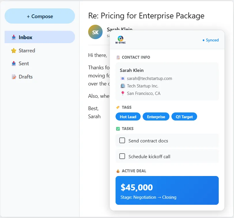 M‑Sync is a Chrome Extension that shows CRM contact details, latest tasks, deals, notes, and tags directly beside the email. If the sender isn’t in your CRM, M‑Sync them in seconds*.